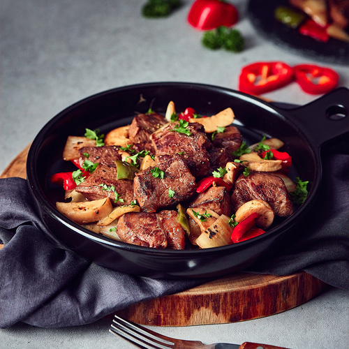 두툼한 부채살을 큼지막하게 깍뚝 썰어 양파,피망등고 버터로 고소하게 볶아낸 서양요리